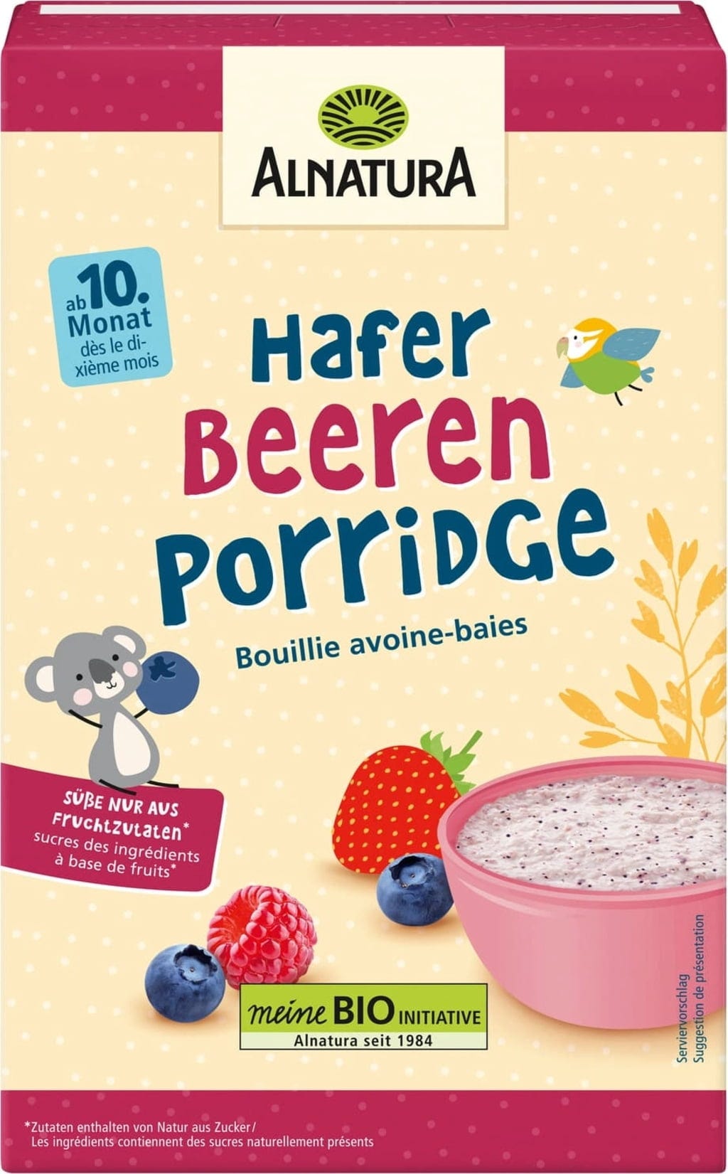 Das Alnatura Bio Hafer-Beeren-Porridge bietet eine mild-fruchtige Mahlzeit. Das Porridge mit zarten Hafervollkornflocken und feinen Beeren ist weich und leicht zu kauen. Somit ist es ideal für Kinder ab dem 10. Lebensmonat. Es gelingt warm und kalt und ist im Handumdrehen zubereitet.