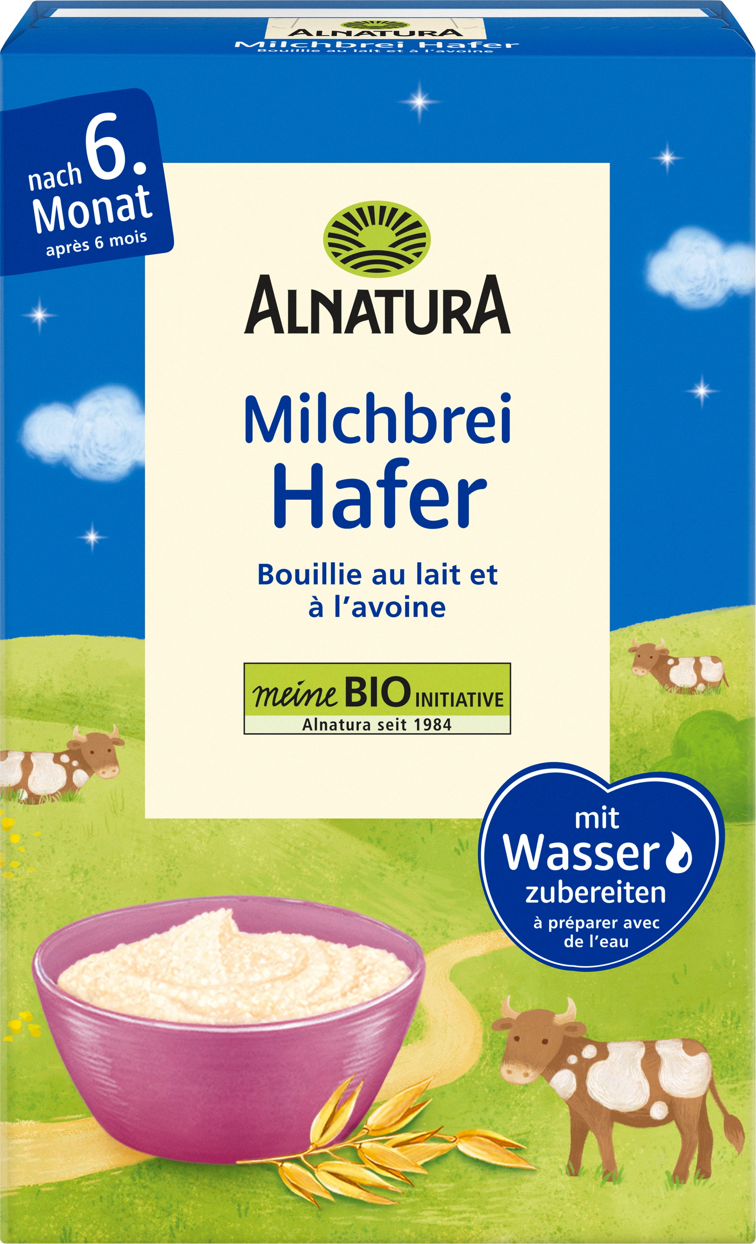 Der feine Alnatura Bio Hafer Milchbrei mit Hafervollkornmehl und ohne Zuckerzusatz (Zutaten enthalten von Natur aus Zucker) eignet sich für Babys ab dem 6. Lebensmonat. Ideal als Abendmahlzeit, kann aber auch bestens in der Familienküche kreative Verwendung finden. Zubereitung mit Wasser ist schnell und einfach.