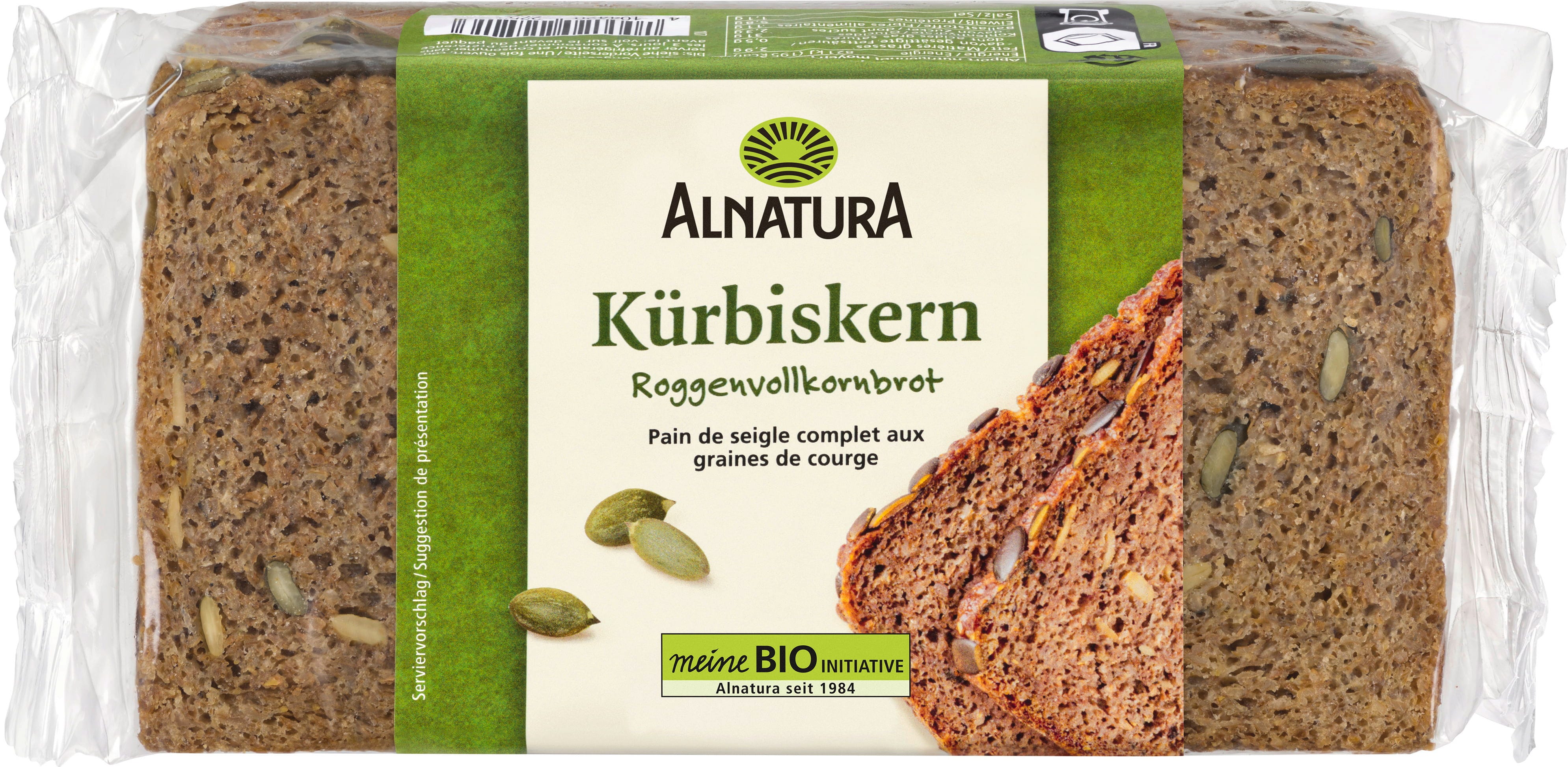Das Bio Kürbiskernbrot von Alnatura ist ein saftiges Roggenvollkornbrot, das durch Kürbiskerne seinen aromatisch-nussigen Geschmack erhält. Es ist bereits vorgeschnitten und eignet sich hervorragend für süße und pikante Beläge.