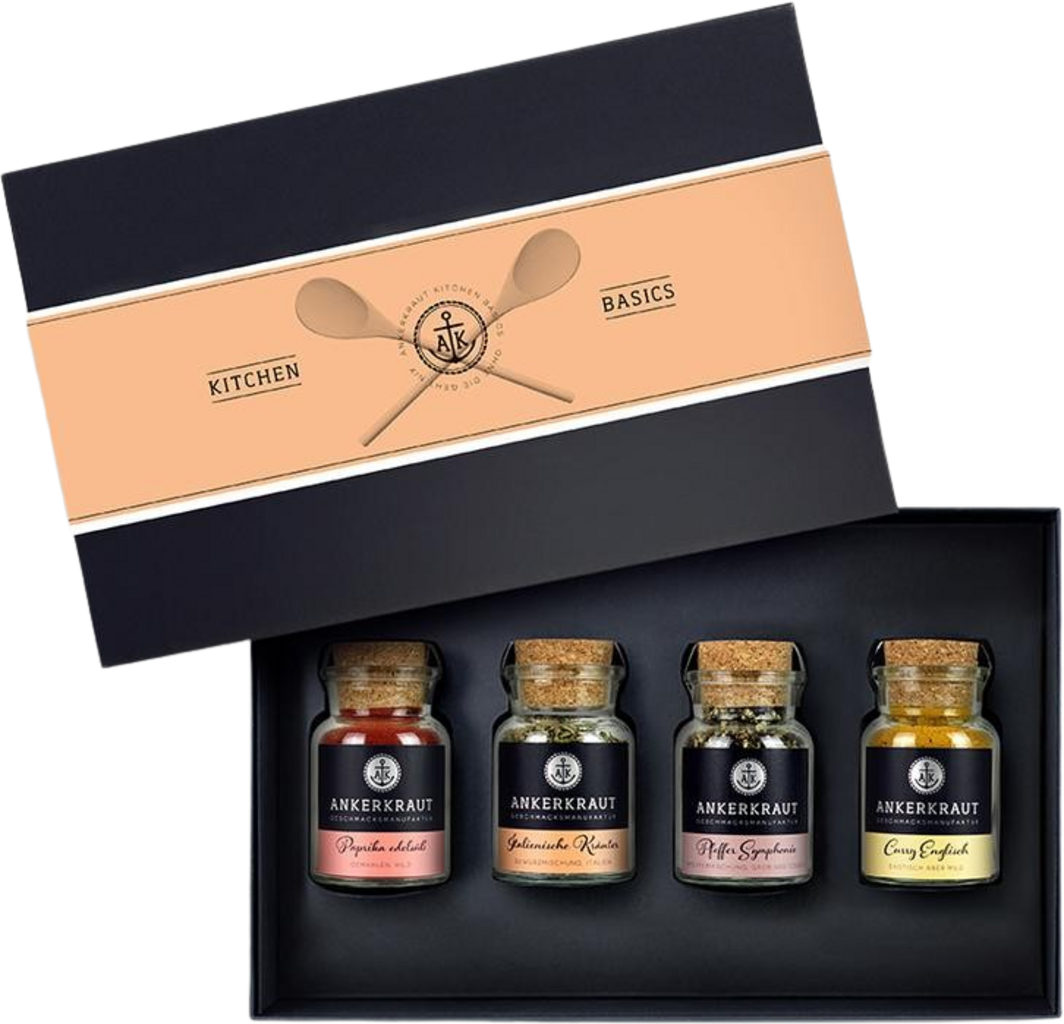 Mit diesem Set schenkst du vier klassische Gewürze, die in keiner Küche fehlen sollten - eben sogenannte "Kitchen Basics". Verpackt sind die an sich schon schönen Korkengläser in einer eleganten, schwarzen Kartonbox mit bedruckter Banderole.