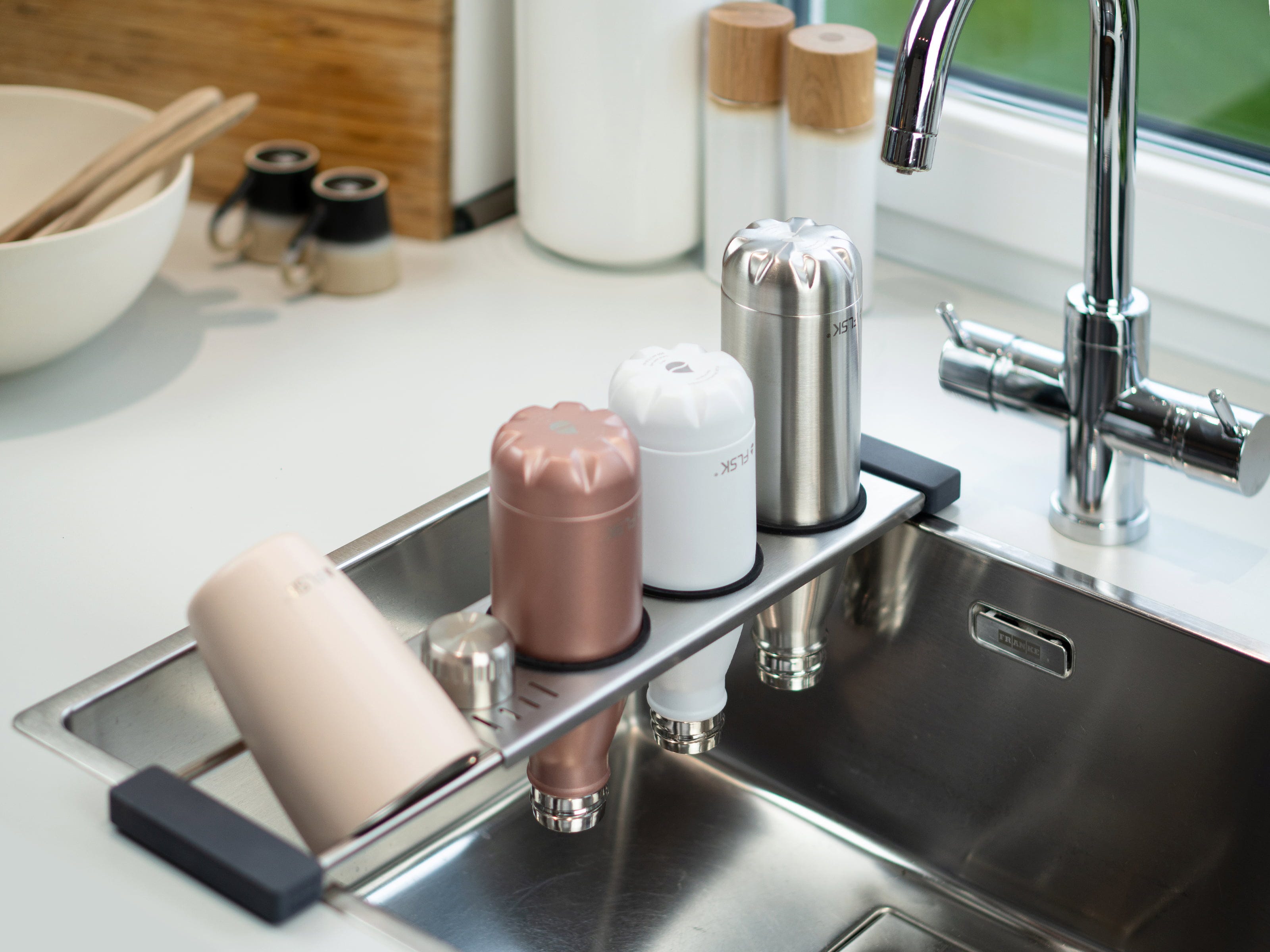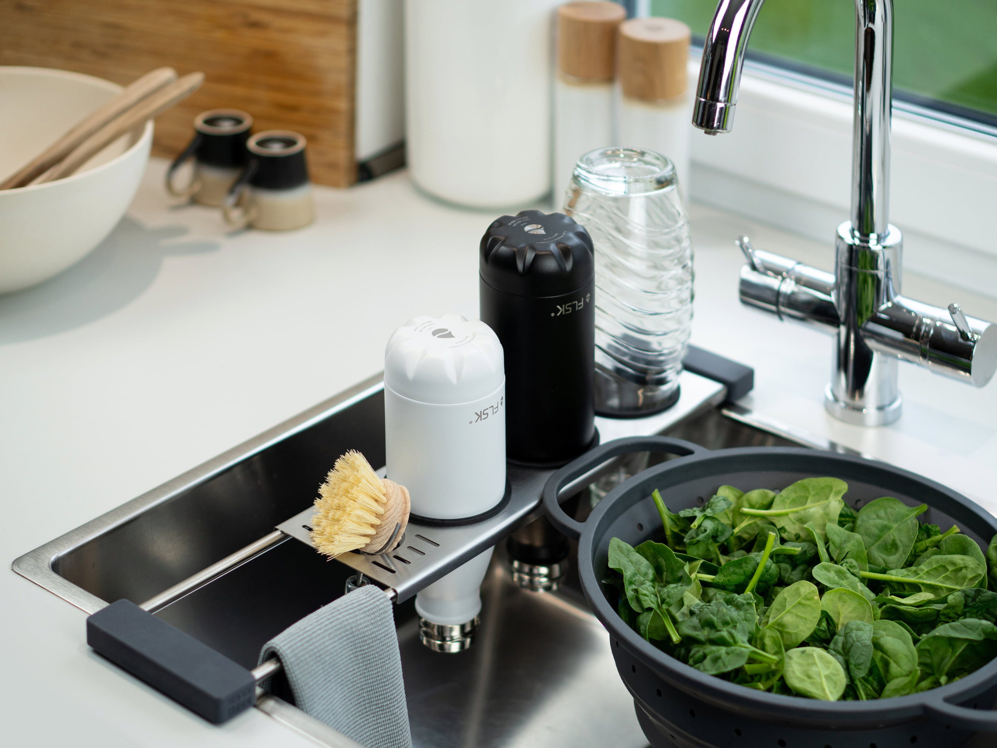 Neben Flaschen finden auch Deckel, Bürsten und Schwämme auf der zusätzlichen Ablagefläche ihren festen Platz zum Trocknen, was die Keimbildung effektiv reduziert. Durch die praktische Teleskopfunktion lässt sich drip.it+ flexibel auf fast jede Spüle anpassen und dient so sogar als stabile Halterung für dein Sieb beim Abgießen von Pasta oder Salat. Ein robuster und langlebiger Allrounder, der nach dem Einsatz ganz einfach und platzsparend verstaut werden kann.