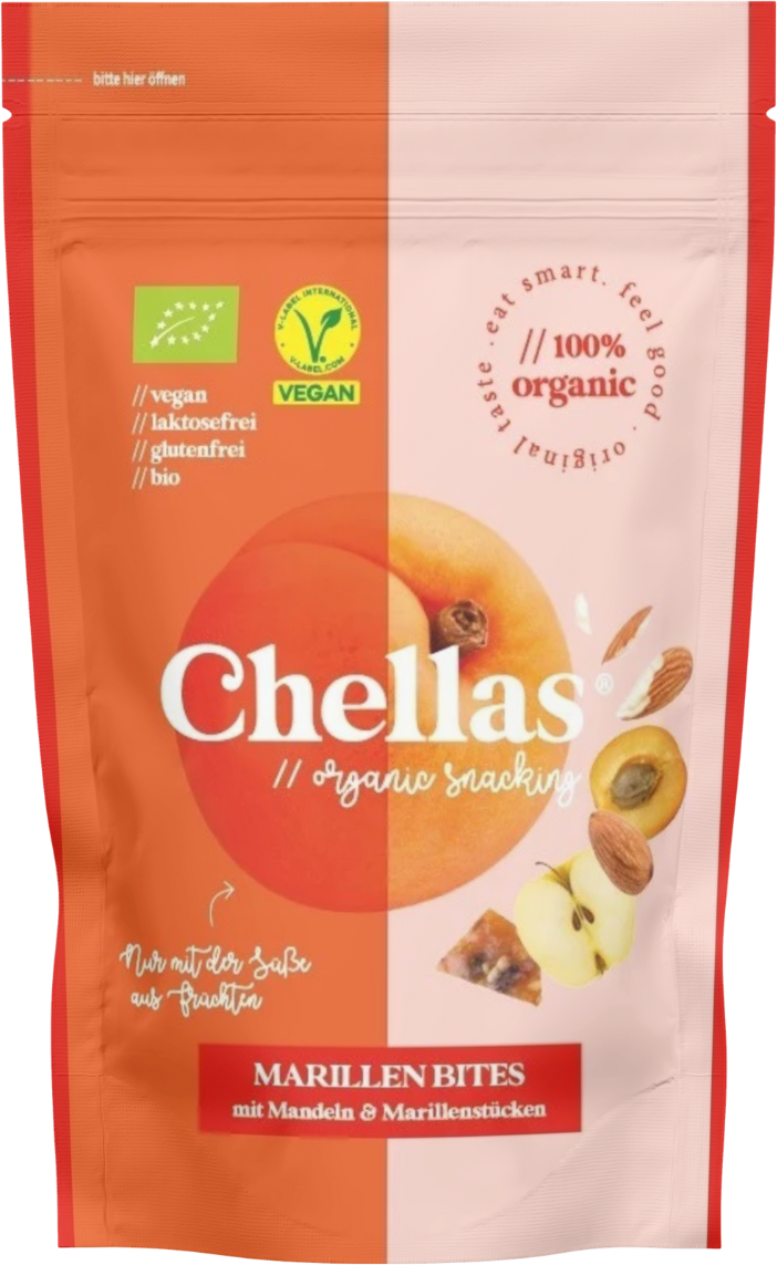 Fruchtig, knackig, unverwechselbar: Die Bio Marillen Bites von Chellas vereinen den sonnigen Geschmack reifer Marillen mit feinen Mandeln zu einem Snack, der ganz ohne Zusätze auskommt. Die Süße kommt hier ausschließlich aus der Natur. Die köstliche Rezeptur kommt ganz ohne künstliche Aromen, Konservierungsstoffe oder Palmöl aus. Hergestellt in sorgfältiger Handarbeit in Österreich und selbstverständlich Bio-zertifiziert, sind Chellas Bites mehr als nur ein Snack im praktischen Format. Vegan, glutenfrei und laktosefrei passen sie perfekt in jeden Alltag.