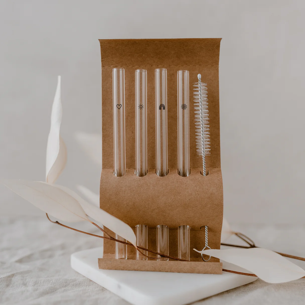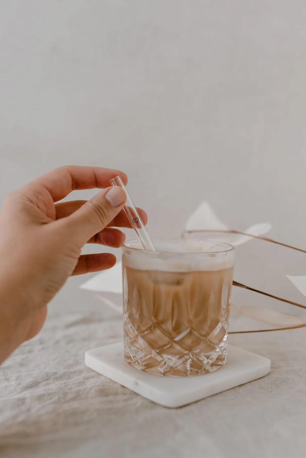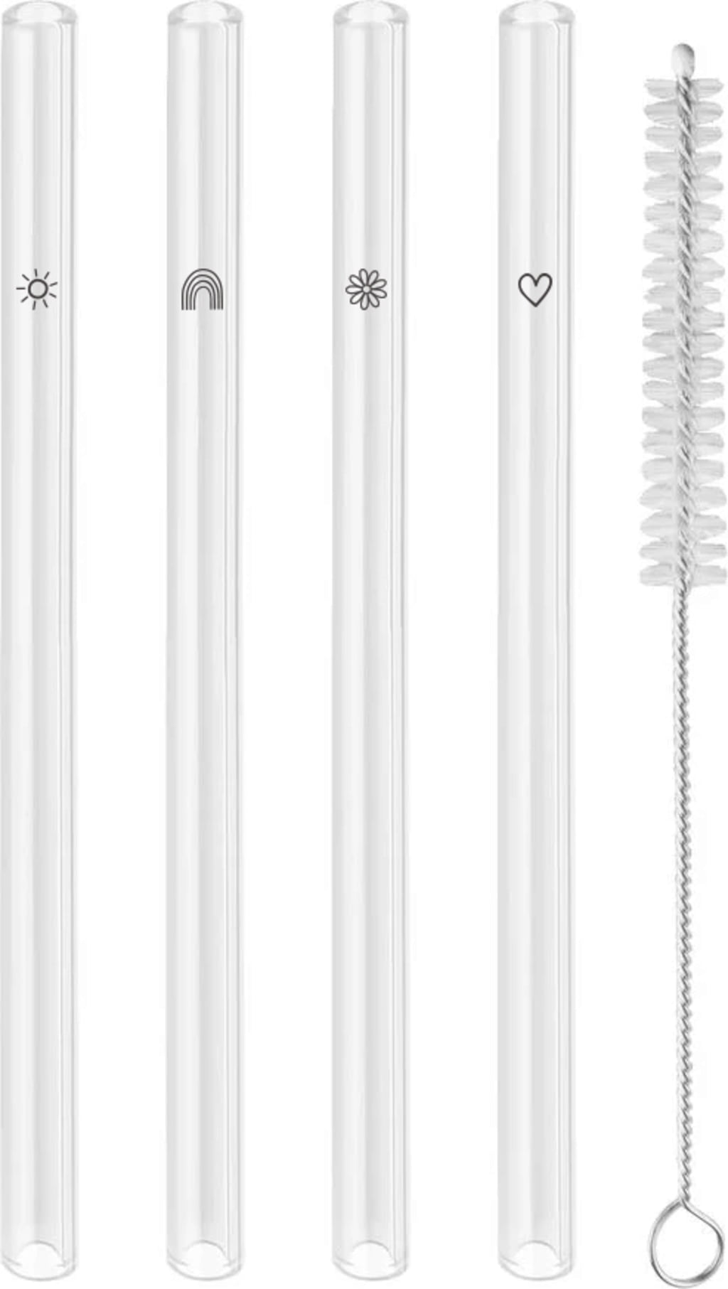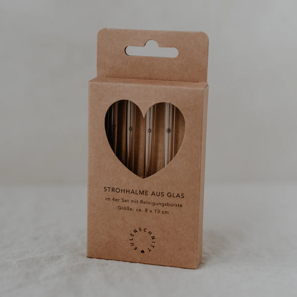 Hitzebeständige Strohhalme aus Borosilikatglas mit stilvollen schwarzen Akzenten. Gereinigt werden können die Strohhalme entweder in der Spülmaschine oder mit dem beiliegenden Bürstchen.