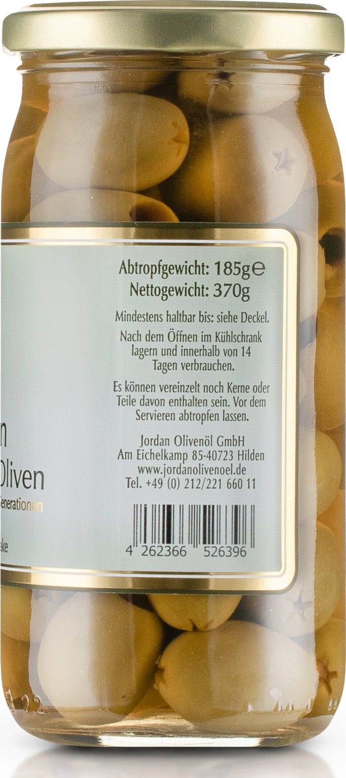 | Verantwortliches Lebensmittelunternehmen: | Jordan Olivenöl GmbH, Landwehr 25, 42697, Solingen, Deutschland, www.jordanolivenoel.de |