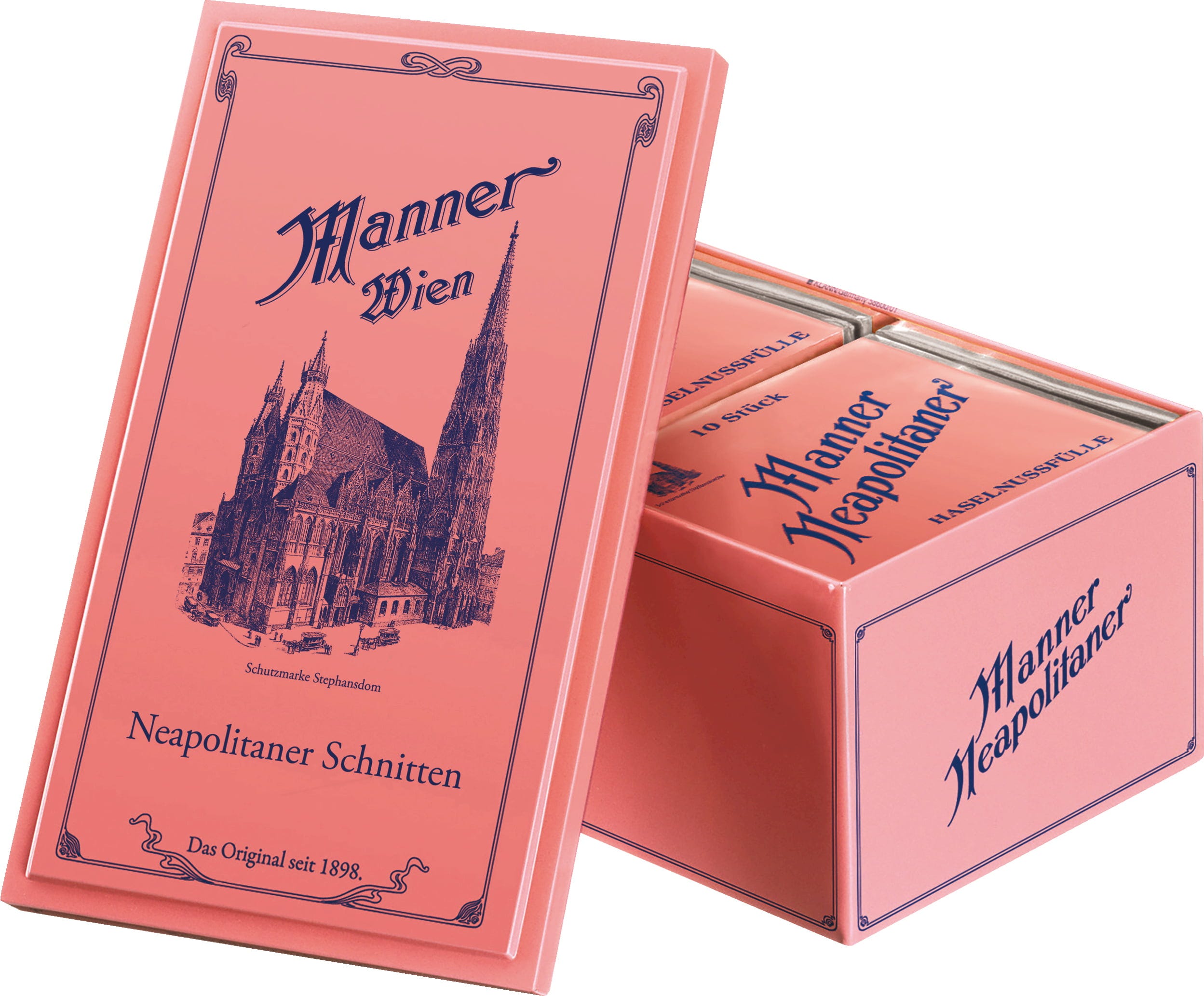 Die Wiener Stephanskirche ziert diese Original Manner Nostalgiebox die anlässlich des 100. Geburtstages, der Original Manner Neapolitaner Schnitten neu aufgelegt wurde. Das Motiv wurde der ursprünglichen Kartonverpackung der Waffeln aus dem Jahre 1898 nachempfunden. Die Dose enthält 8 x 75g Schnittenpackungen, ebenfalls im zuckersüßen Retrodesign. Das Format der Verpackung mit dem typischen roten Aufreißfaden zählt zu den österreichischen „Design-Klassikern“ und ist mittlerweile Kult. 4 köstliche Lagen Haselnusscreme zwischen 5 Lagen krosser Waffel, mundgerecht bemessen machen die Wiener Süßigkeit weltweit unverwechselbar.