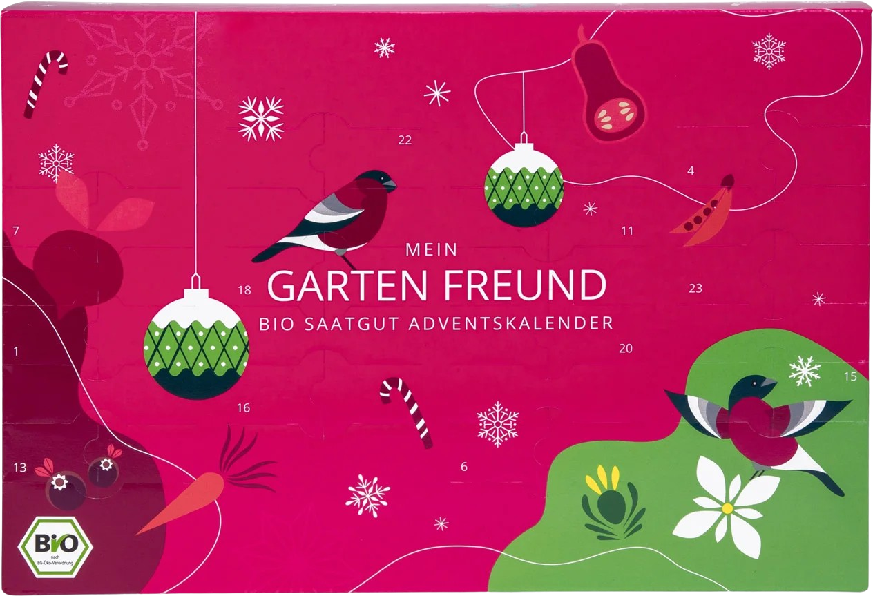 Der Adventskalender enthält 24 verschiedene Bio-Saatgutarten für Gemüse sowie Kräuter, die auch in kleinen Gärten gezogen werden können und bietet eine Vielfalt für Beete, Hochbeete, Balkon oder Terrasse. Überdies ist das Saatgut frei von Gentechnik, besitzt eine hohe Keimfähigkeit und ist samenfest.