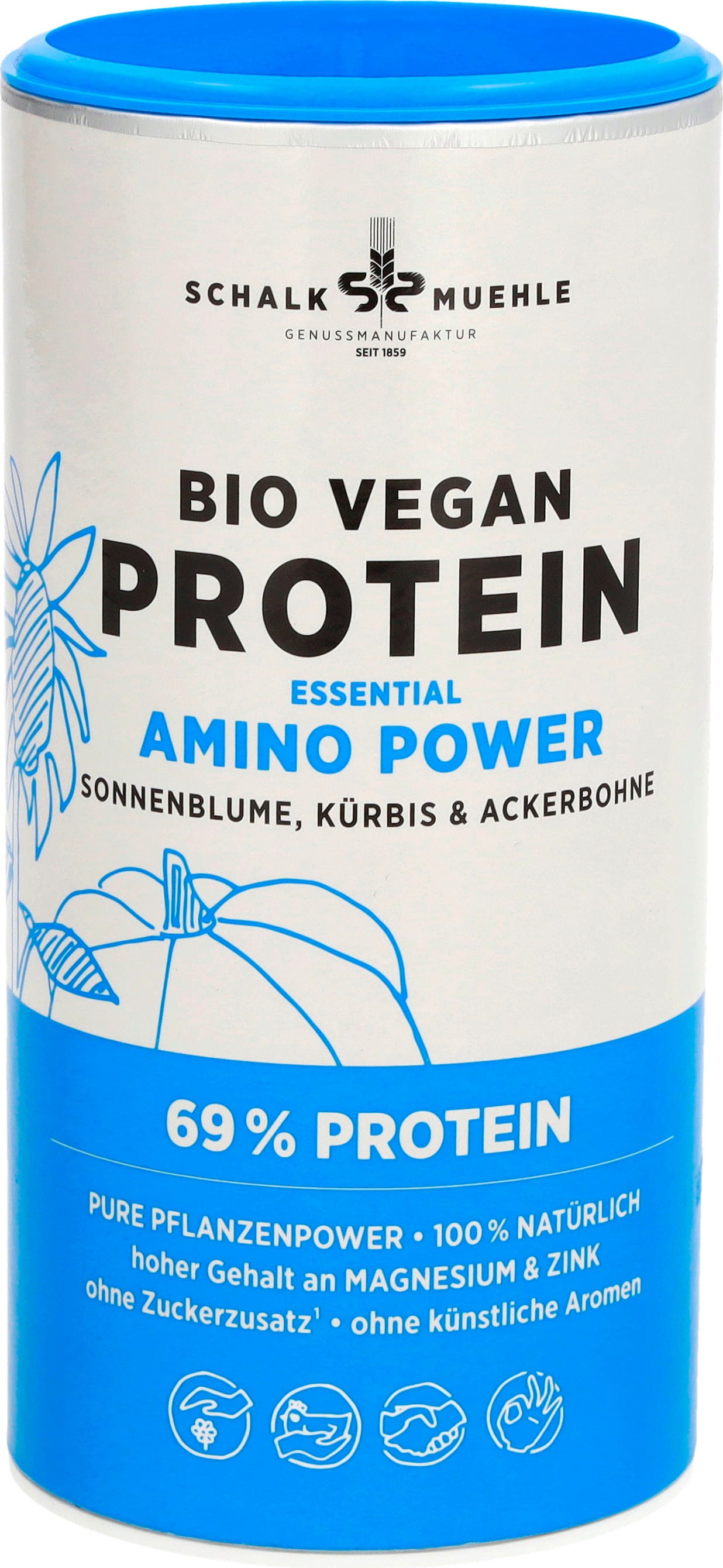 Dieser Proteinmix hat es in sich – das Bio Vegan Essential Amino Power Proteinpulver von Schalk Mühle liefert dir nicht nur reichlich Protein, sondern auch alle essentiellen Aminosäuren sowie einen hohen Gehalt an Magnesium und Zink. Der hochwertige Mix besteht aus Sonnenblumenkernen, Ackerbohnen und Kürbiskernen. Die Rezeptur ist zu 100 % pflanzlich und frei von Zuckerzusatz. Somit lässt es sich perfekt in einen veganen und abwechslungsreichen Lebensstil integrieren.