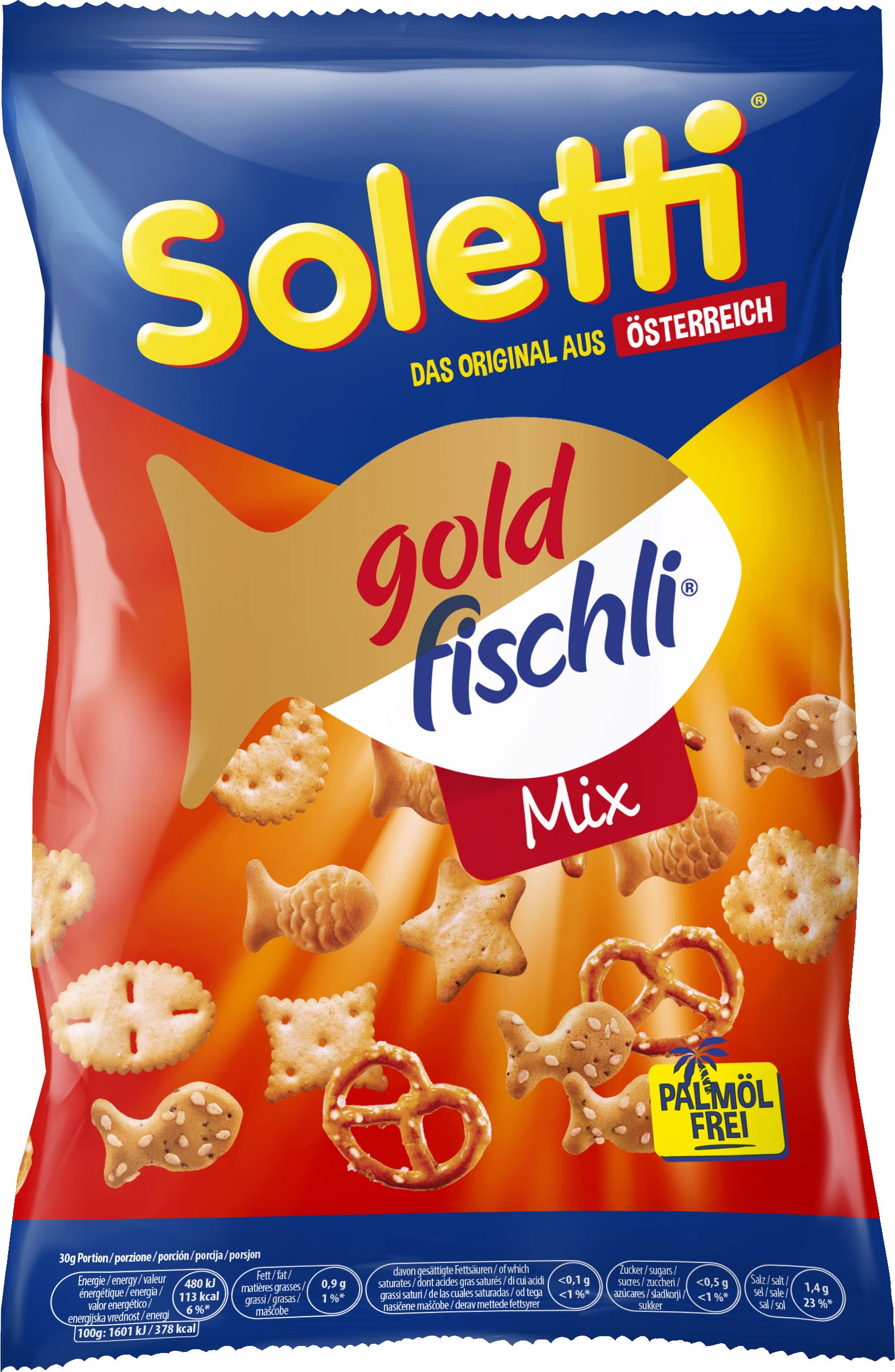 Der Soletti goldfischli Mix enthält eine knusprige Mischung aus Salz- und Laugengebäck. Perfekt als Mitbringsel für den Filmabend. Die Rezeptur ist frei von Palmöl.