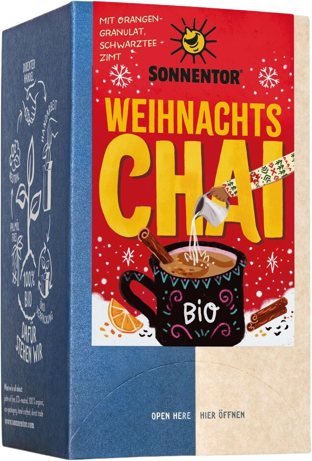 Lass die Lichterketten in deiner Küche angehen und hol dir die pure Festtagsstimmung in deine Tasse! Dieser Bio-Weihnachts-Chai von Sonnentor ist die ideale Begleitung für die kalte Jahreszeit. Hier treffen kräftiger Assam-Schwarztee und warme, weihnachtliche Gewürze wie Zimt und Nelken auf die süße Note von Süßholz und Kakaoschalen.