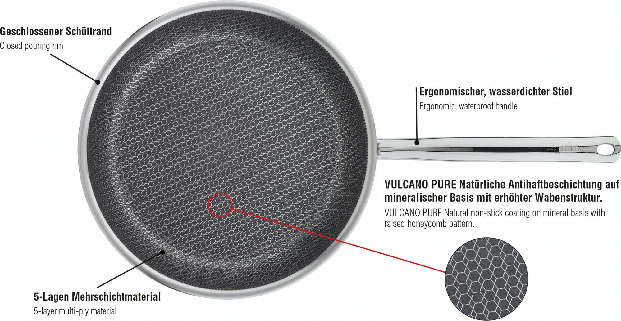 Die Bratpfanne Vulcano Cut Resist Pure von Spring ist die perfekte Wahl für alle, die in der Küche keine Kompromisse eingehen wollen! Das Highlight dieser Pfanne ist die innovative, erhabene Wabenstruktur aus Edelstahl. Sie schützt die mineralische Antihaftbeschichtung so effektiv, dass du sogar bedenkenlos Pfannenwender aus Metall verwenden kannst.