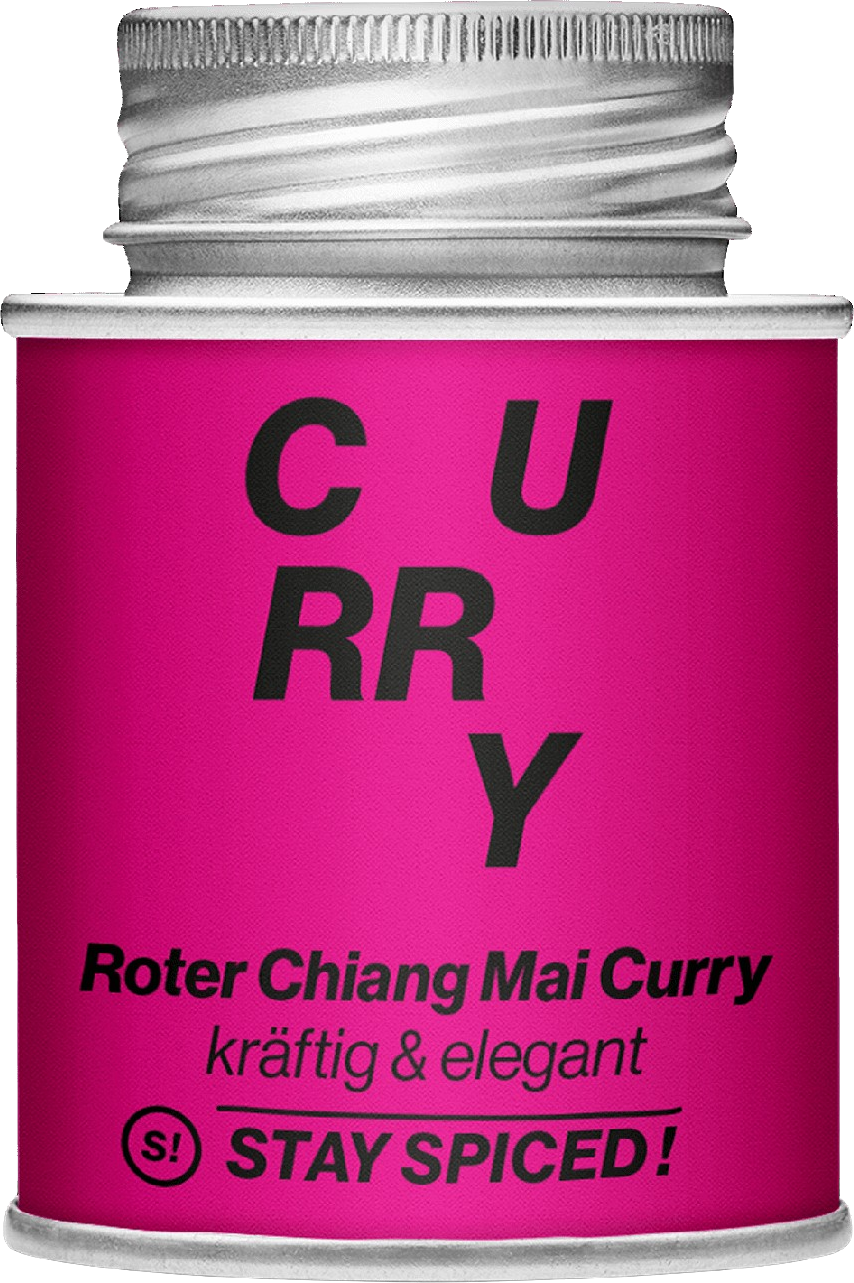 Ein wahres Feuerwerk an Aromen und Geschmack: Die Gewürzmischung Stay Spiced! Roter Chiang Mai Curry enthält ganze 22 Zutaten. Die Gewürze von Anchochili bis Zimt verleihen der Mischung fruchtig-scharfe, säuerliche, herbe/bittere aber auch süßliche Nuancen.